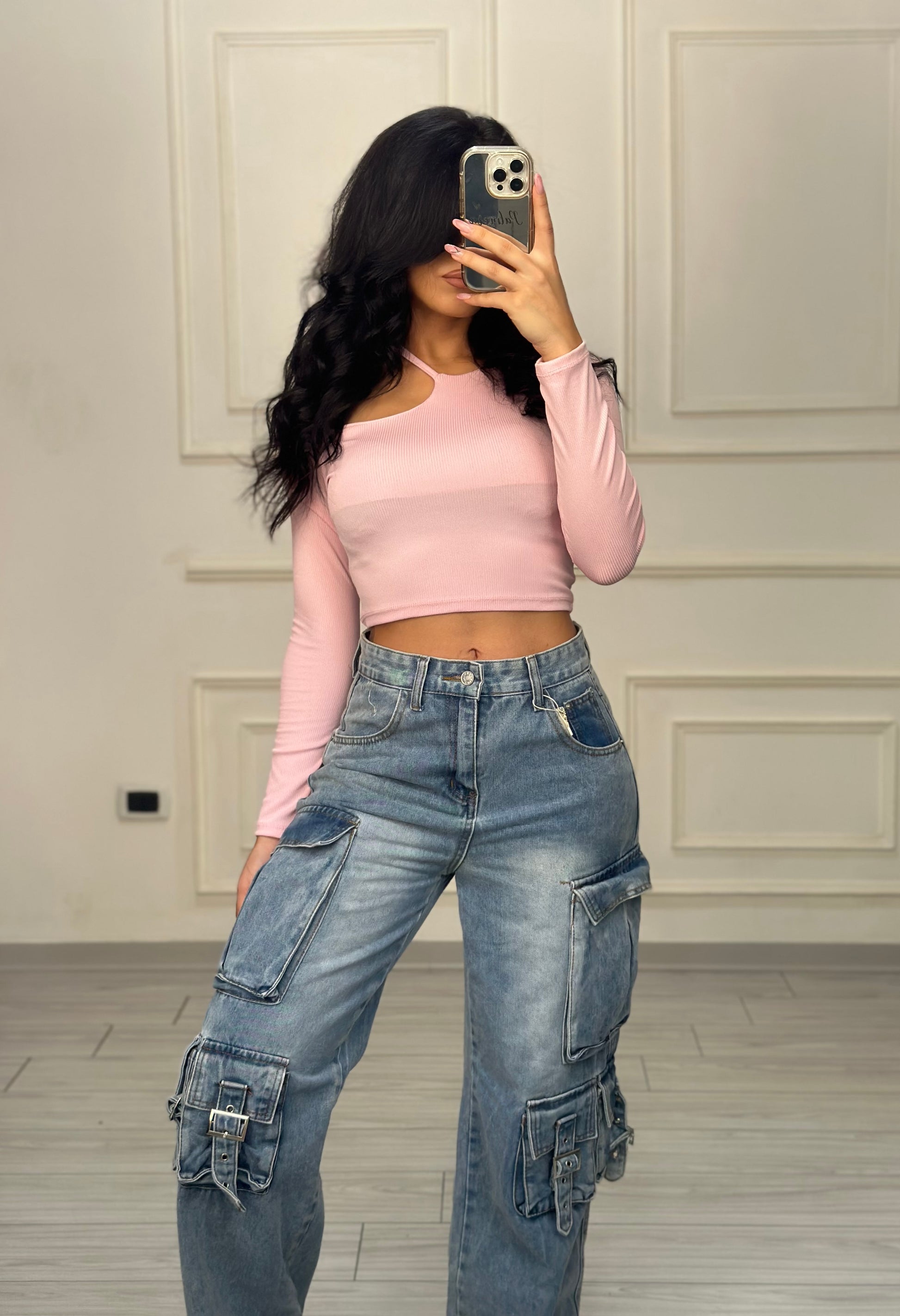Top in Taglia unica con scollo asimmetrico. Tessuto elasticizzato. Comodo, versatile.