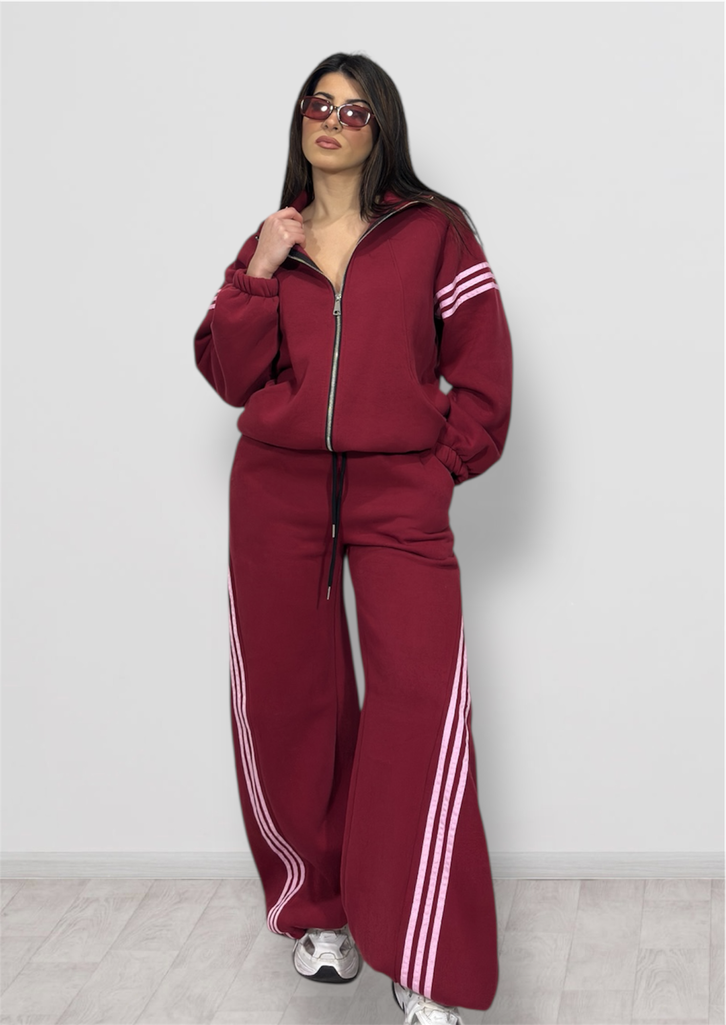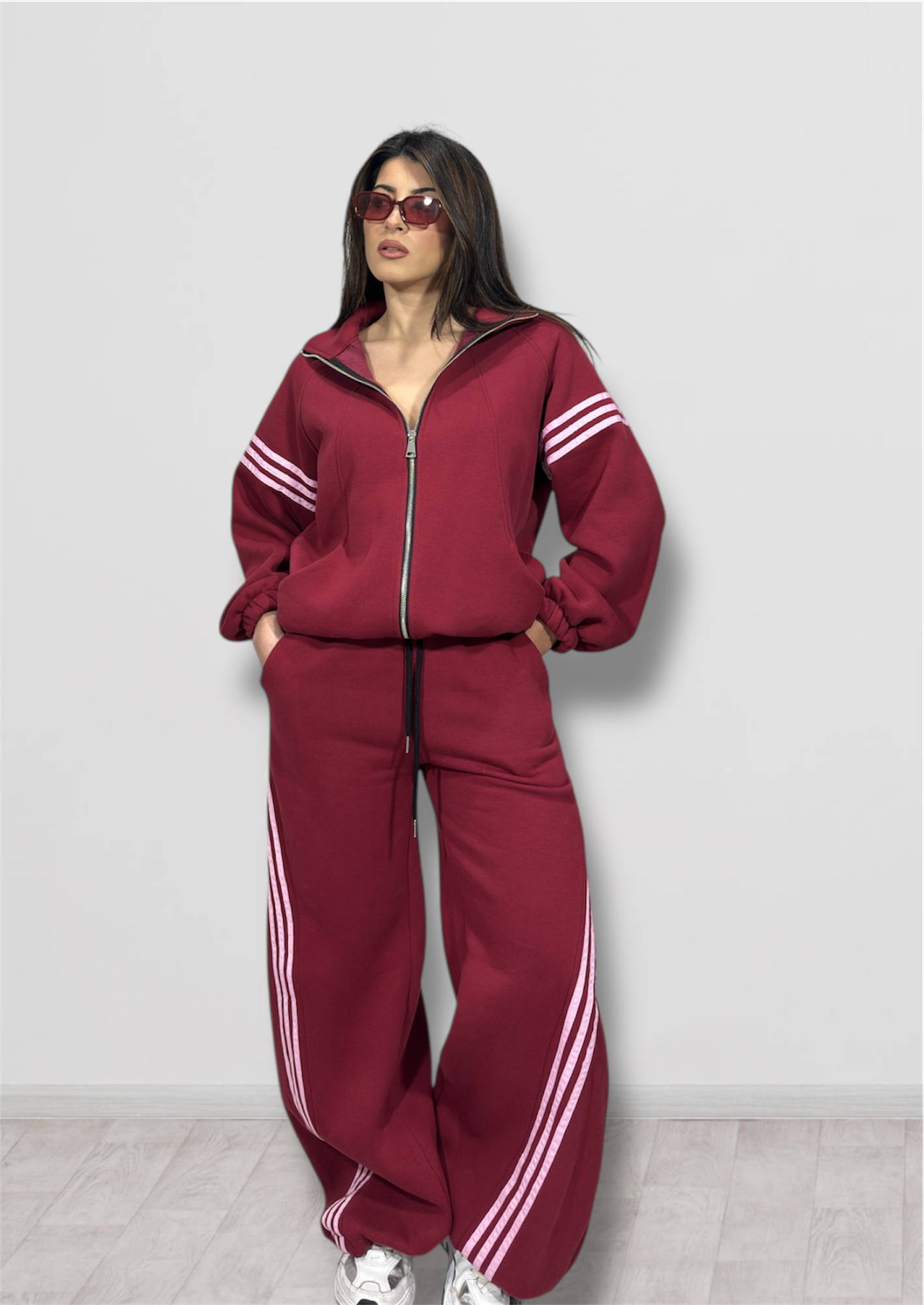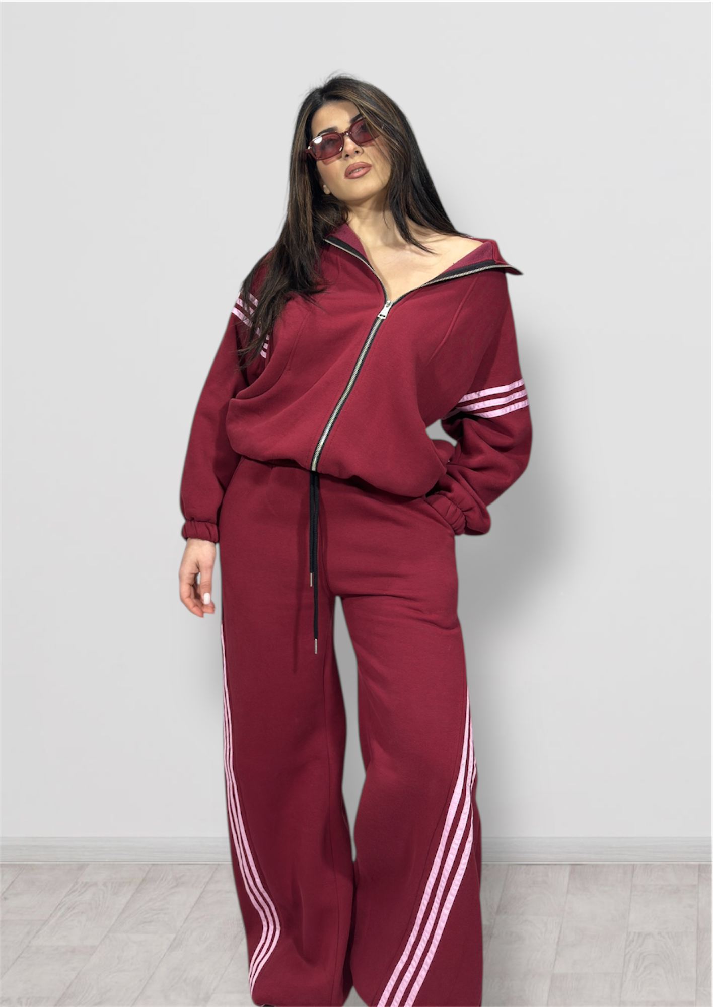 Tuta super felpata in taglia unica composta da pantalone parachute e maxi felpa con zip.