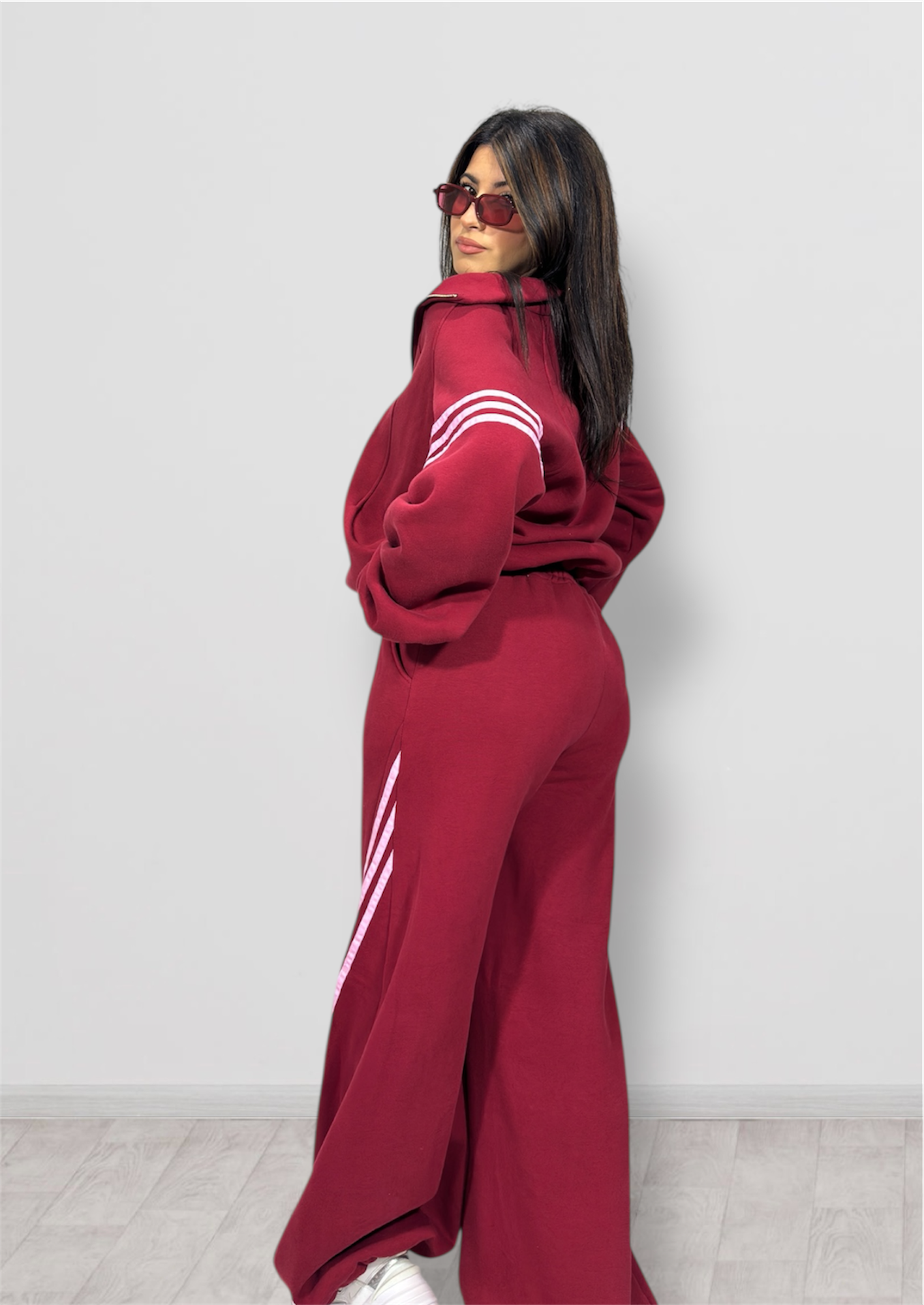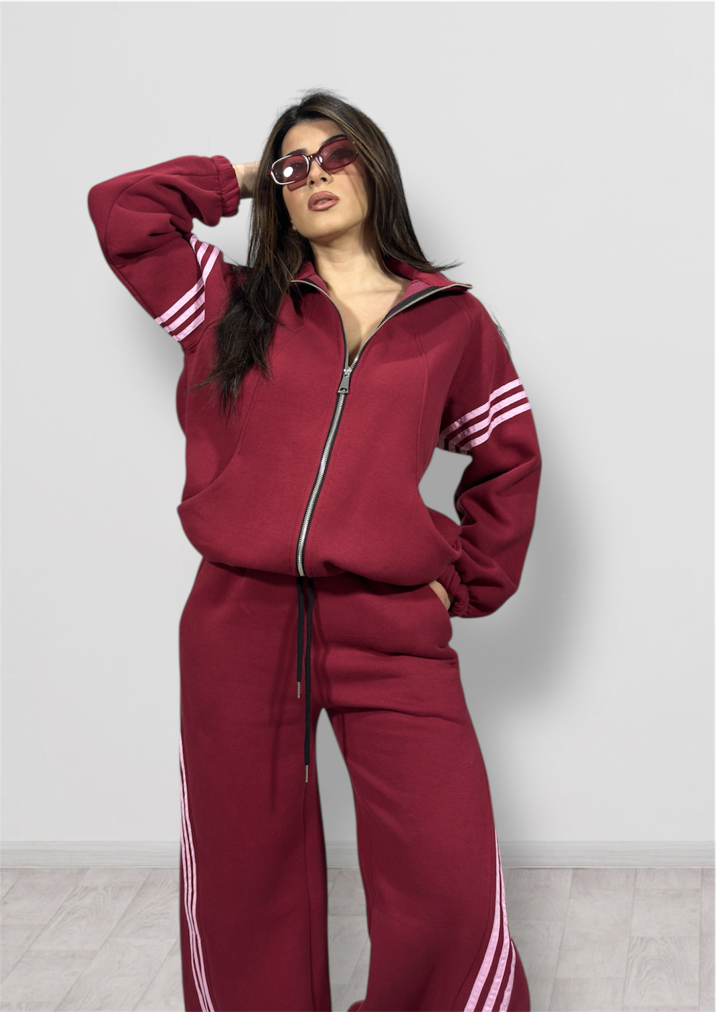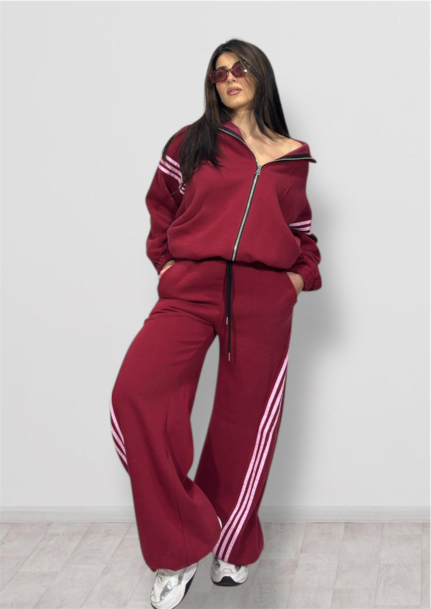 Tuta super felpata in taglia unica composta da pantalone parachute e maxi felpa con zip.